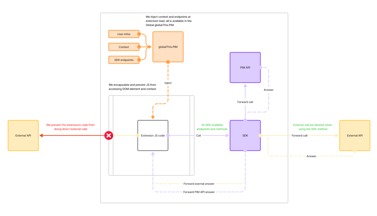 Extensions run within the Akeneo PIM application itself, executed in a secure sandbox environment. This architecture provides several benefits: